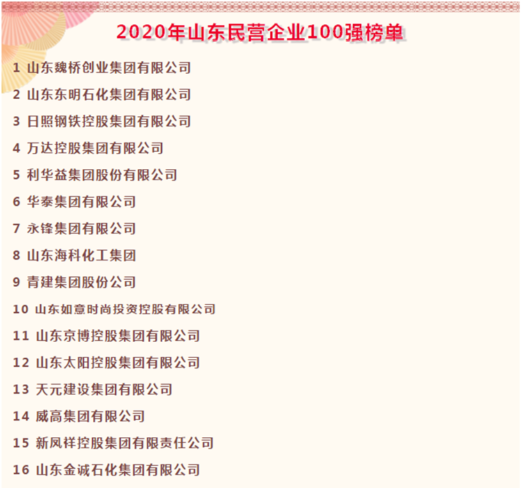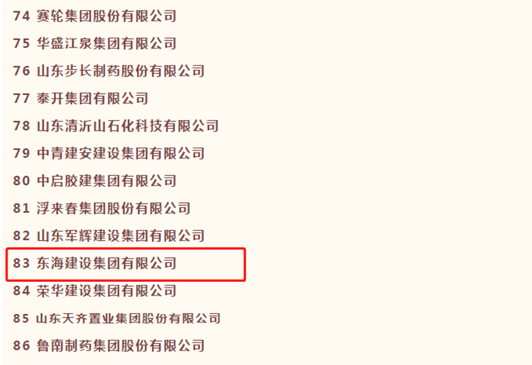 10月20日,2020年“山东民营企业100强”榜单发布,东海集团再次荣登榜单,充分彰显了集团的综合实力。据悉,本次评选和发布由省工商联、省工业和信息化厅、省农业农村厅、省商务厅、省税务局、省市场监管局共同组织,旨在发挥先进典型的示范引领作用,积极营造促进民营经济发展的良好氛围,这也是东海集团第四次入榜,2020年比2019年公布的榜单前进了10名,位列第83位,为德州市上榜两家民企之一。