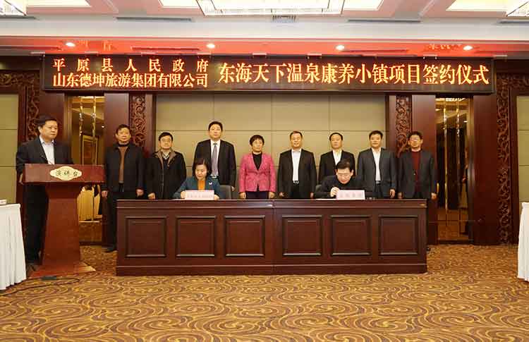 2月10日上午,平原县人民政府、山东德坤旅游集团有限公司“东海天下温泉康养小镇项目”正式签约,这标志着东海集团在文化旅游产业方面的发展迈出实质性一步。签约仪式上,德坤旅游集团执行总经理赵英旭和平原县副县长何新梅分别代表德坤旅游集团与平原县政府签署合作协议。平原县委书记王洪霞,平原县委副书记、县长袁志勇,东海集团董事长魏建国,平原县副县长杨传智,以及平原县旅游局、国土局、规划局、三唐乡等相关单位领导出席签约仪式。该项目的启动,将为推动我市旅游产业发展,繁荣地方经济,改善民生、促进就业起到拉动作用。