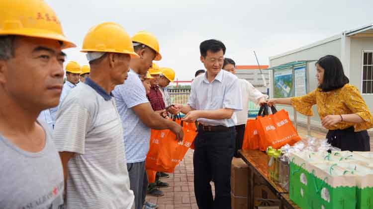 7月10日上午,经开区领导贾长群率区工会、文明办相关负责人来到东海集团三东筑工装配式建筑产业示范基地PC工厂项目,走访慰问一线工作人员。 当天,慰问组为项目一线工作人员送上绿豆、毛巾、茶叶等防暑降温用品,并向他们的敬业和付出表示感谢,希望大家在各自的岗位上认真工作、积极作为,全力做好各项创卫、创城工作任务。慰问结束后,慰问组对三东筑工装配式建筑产业示范基地PC工厂进行了参观考察。贾长群一行对东海集团加快装配式产业项目建设,推动德州建筑产业转型升级的做法给予充分肯定。