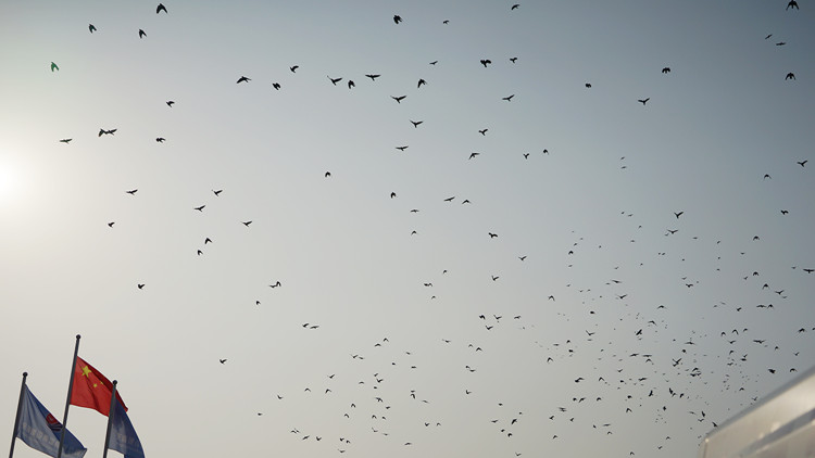 一群喜鹊从东海天下项目上空飞过