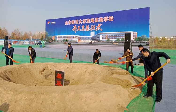 当天,来自教育系统、晏城街道、东海集团的干部职工代表及作业机械、挖掘机方队等均成一字排开,阵列有序,等待奠基仪式开幕。随着齐河县副县长王炜的开场致辞,山师东海实验学校开工奠基仪式正式拉开帷幕,当天出席奠基仪式的还有齐河县政府、教育局、晏城街道党工委、山师基础教育集团等领导代表。 首先是齐河县政府党组成员、教育局局长葛富义发言致辞。他强调,山师东海实验学校由东海集团出资代建,山师教育集团管理,该学校是一所九年制一贯公办学校,是全县重要的民生工程,也是山东师范大学和县政府重点合作项目。相信以山师集团和东海集团的实力,完全可以强强联合,将山师东海实验学校建成高品质、高品位、高水准的学校,打造成齐河民生项目的样板。 随后,齐河清河园项目总监翟东超表示,东海集团感谢齐河人民的厚爱,以民营企业的责任回馈齐河百姓,以东海的实力建最好的学校,打造民生工程品牌。齐河山师东海实验学校的建设,将为广大师生创造良好的教育学习环境,势必成为齐河县乃至德州市、山东省示范级的优秀学校。 致辞完毕,仪式进行到最后一项,领导及嘉宾走到奠基碑前,拿起铁锹,一锹一锹将土填进奠基坑,也将对齐河优质教育的热切盼望和对孩子们的希望,埋在了这片热土。至此,山师东海实验学校开工奠基仪式圆满结束。 县政府领导代表一行在仪式结束后共同来到东海·清河园营销中心、景观区及样板房进行实地参观指导,县领导对东海集团项目规划和建设品质,给予充分的肯定和高度认可,赞扬东海集团为齐河地产标杆企业,并要求其充分发挥企业优势,起到模范带头作用。