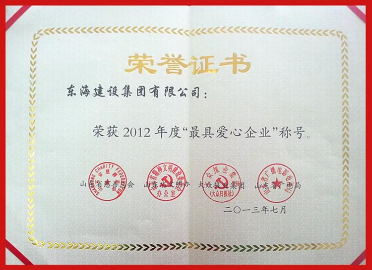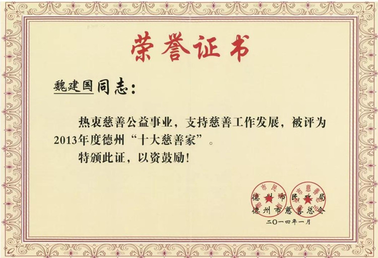 东海集团自成立以来,努力做到发展不忘回报社会,将“社会效益优先,企业利益在后”载入东海集团企业文化理念中,一直把关心支持社会公益事业特别是教育事业,作为企业应尽的责任,相继参与了“春蕾行动”、“童缘行动”、“朝阳助学”等活动,累计向社会捐款捐物2800多万元,受到政府和社会的广泛赞誉。集团先后多次获得省市“最具爱心捐赠企业”、“山东省民营企业公益之星”、“捐资助学先进单位”等荣誉,魏建国董事长更是被评为德州市“十大慈善家”、“最具爱心捐赠个人”等荣誉。