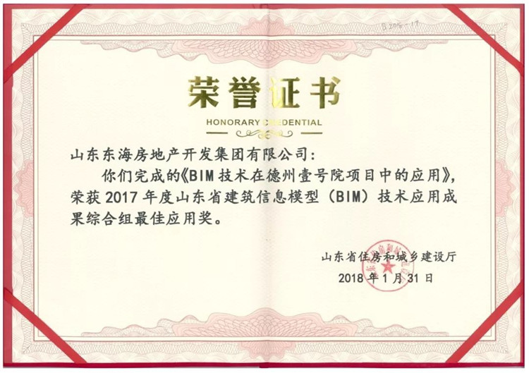 东海集团紧跟时代潮流,积极参与建筑信息模型(BIM)技术的应用以及推广,多次组织学习、推广活动,并积极参加各种BIM培训及交流会议,为BIM技术在今后的推广以及项目的应用打下了良好的基础,为提高企业技术水平及研发能力提供了有力的保障。我集团主导的《BIM技术在德州壹号院项目中的应用》,荣获2017年度山东省建筑信息模型(BIM)技术应用成果综合组最佳应用奖。