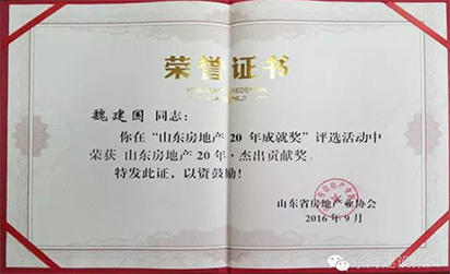 魏建国董事长荣获“山东房地产20年•杰出贡献奖”