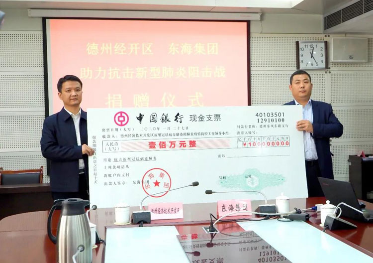 “企业发展了,理应回报社会。做好公益事业,发扬勇于担当的精神是东海人一贯的做法,要积极投身到疫情防控工作中去,为社会贡献一份力量。”东海集团党委书记苏振水坚定地说。作为抗击疫情期间德州市第一家捐款的企业,东海集团的表率作用影响和带动了全社会的捐赠热情。