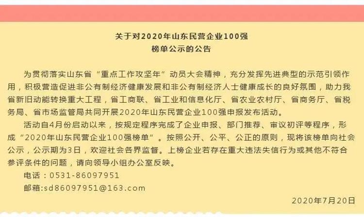 10月20日,2020年“山东民营企业100强”榜单发布,东海集团再次荣登榜单,充分彰显了集团的综合实力。据悉,本次评选和发布由省工商联、省工业和信息化厅、省农业农村厅、省商务厅、省税务局、省市场监管局共同组织,旨在发挥先进典型的示范引领作用,积极营造促进民营经济发展的良好氛围,这也是东海集团第四次入榜,2020年比2019年公布的榜单前进了10名,位列第83位,为德州市上榜两家民企之一。