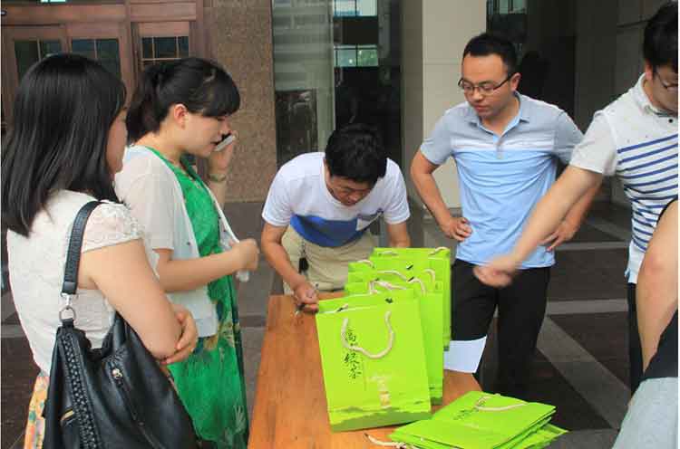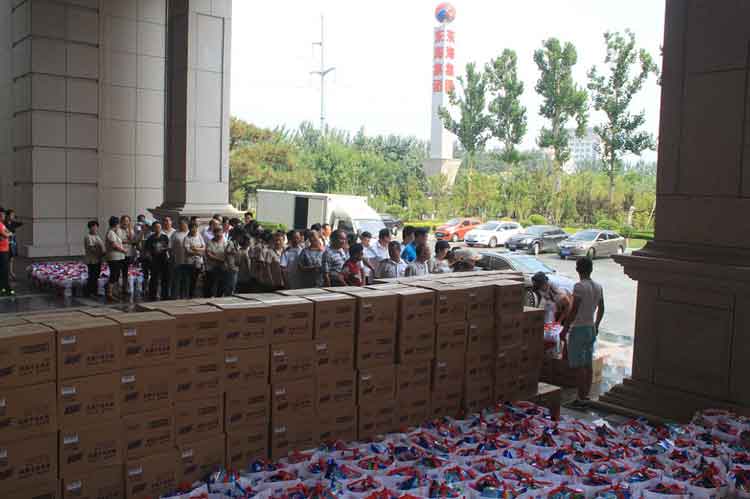东海大厦广场熙熙攘攘,几百名员工集中领取夏日清洁护理用品大礼包。