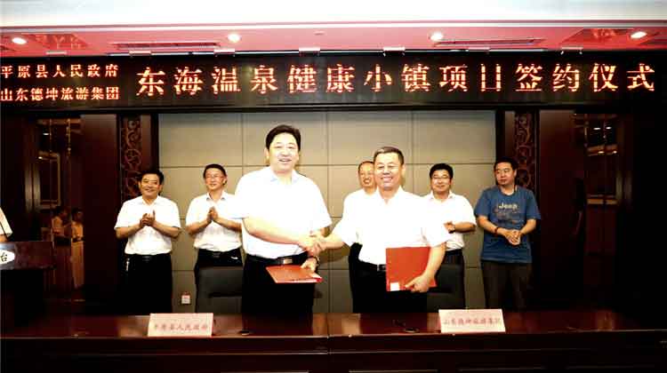 经过前期多次的汇报和洽谈,5月19日下午,平原县人民政府、山东德坤旅游集团有限公司《“东海温泉健康小镇”项目合作框架协议》签约仪式在平原县桃园宾馆顺利举行,标志着地企双方合作迈出实质性一步。德州市旅游协会会长、东海集团董事长魏建国与平原县委副书记、县长袁志勇分别代表山东德坤旅游集团与平原县政府签署框架协议,平原县委书记王洪霞、德州市旅游局局长刘宗斌、德州旅游局副局长孙兵、平原县副县长何新梅、平原县副县长杨传智、山东德坤旅游集团副总经理高健,以及平原县旅游局、国土局、规划局、三唐乡等相关部门领导出席签约仪式。协议就东海集团全资子公司山东德坤旅游集团投资建设“东海温泉健康小镇”项目达成共识,东海文旅从此开启特色小镇时代。