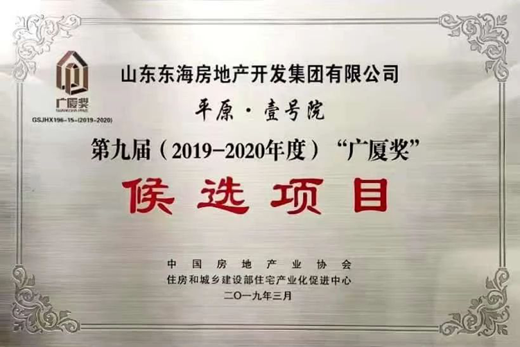 2019-2020年度的第九届广厦奖评选,平原壹号院顺利通过广厦奖初审评定。东海集团开发建设的项目前期已先后有巴黎城、香港城2个项目通过3A级住宅评审并荣获“广厦奖”;德州壹号院、东海玉河院子、临邑东海院子、平原壹号院、邹城东海院子、东城壹号院、禹城东海城相继通过3A级住宅和“广厦奖”初审,截止2019年东海集团共有9个项目获此殊荣,在全市及全省开发企业中独占鳌头、名列前茅。